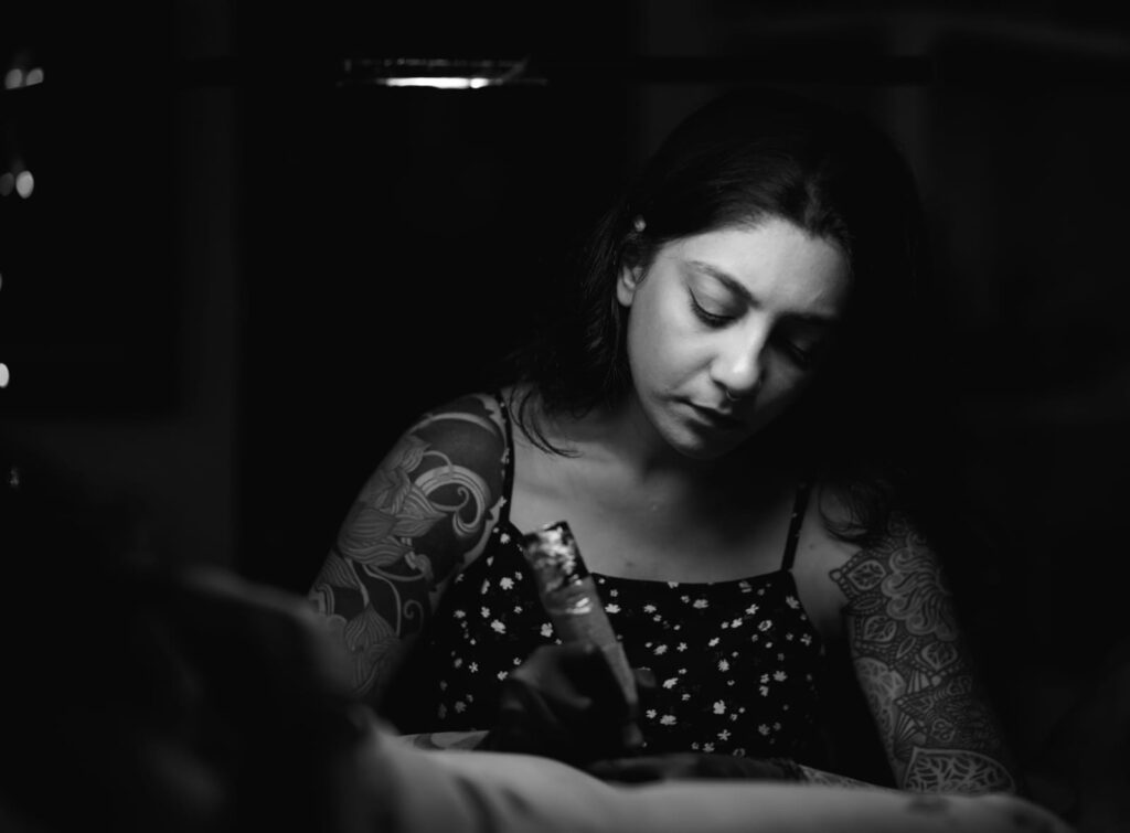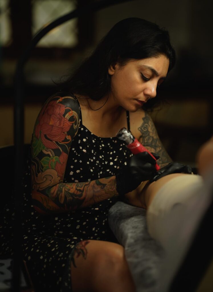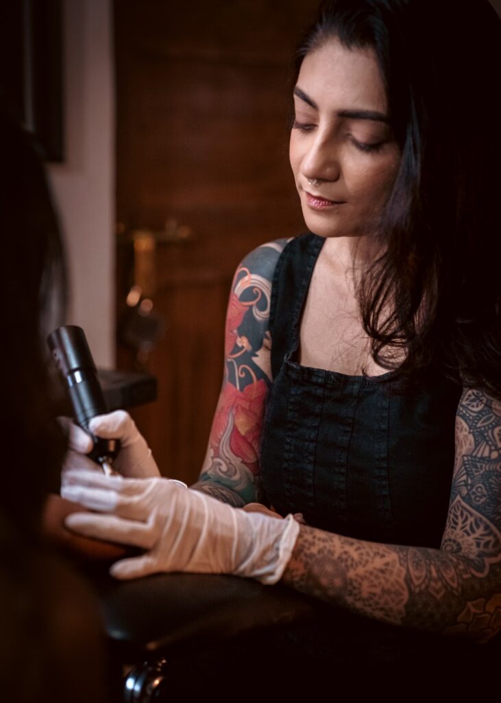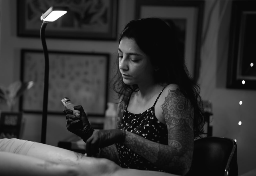 Kruti’s entry into the tattoo world wasn’t a planned career move—it was a serendipitous stumble. In 2010, she walked into a Mumbai tattoo studio and essentially never left. Starting at the front counter, she quickly transitioned into an apprenticeship under Kevin Andrade.
