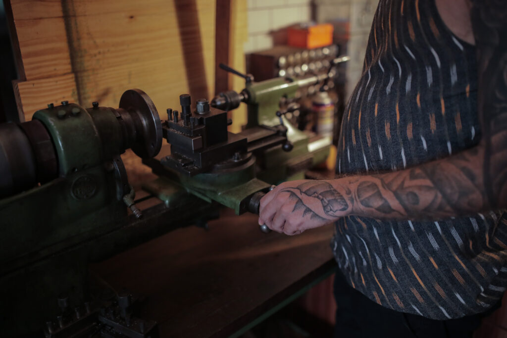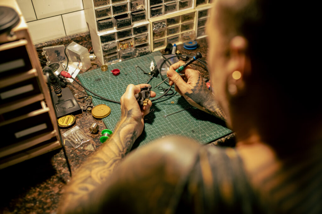 During his early years, he devoted a significant amount of his time to mastering metalwork, creating sculptures, furnitures and custom bicycles. He possessed an incredibly inquisitive mind. When he realized the tattoo industry lacked the proper tools for his style, he leaned directly into his DIY roots. He started researching, doing mathematical calculations, and pouring over manufacturer data sheets just to find the right motor, which would form the basis of his first successful build.