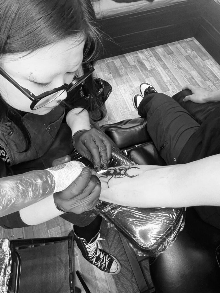 “Most of that learning happens on skin,” she says, admitting to practicing on herself to truly understand how the ink settles. “Ultimately, it comes down to practice.”